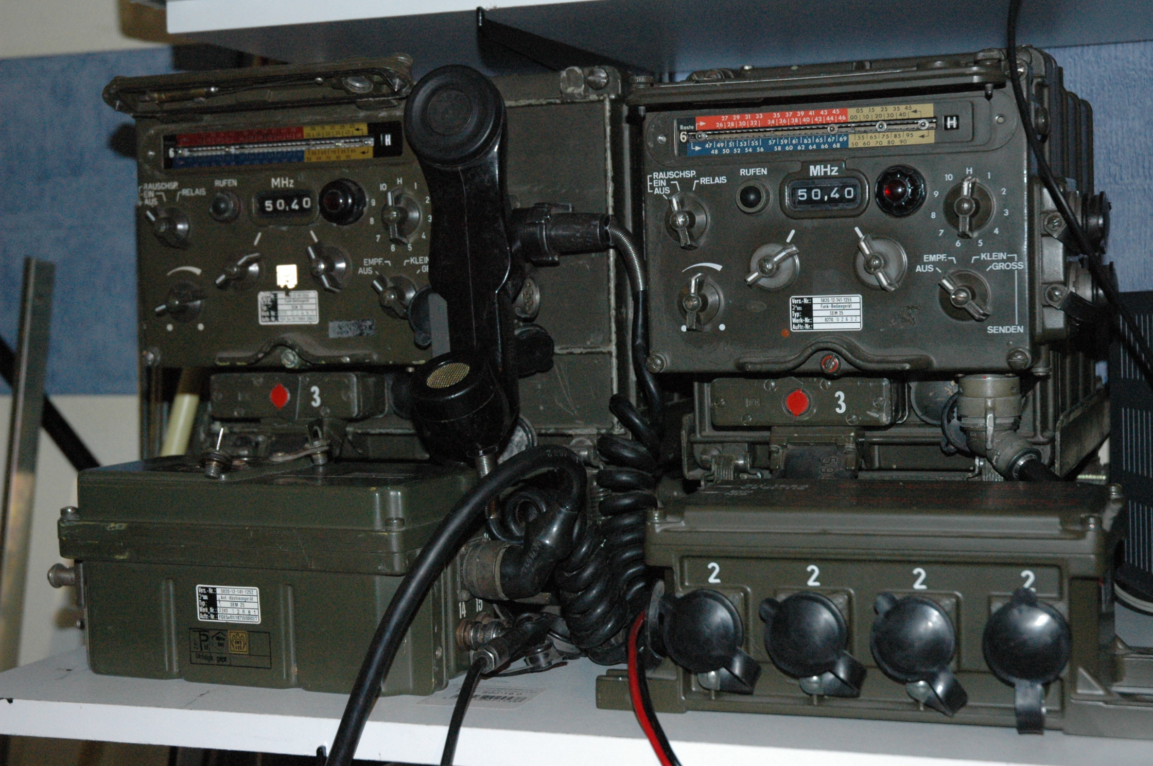 Als laatste staat er nog een schattig stel. De linkse is een SEM25. Een leger FM zend-ontvanger welke een 15W buizen eindtrap heeft en op 24V werkt. Daarnaast staat de EM25. Dat is alleen een ontvanger. Ze zijn gekoppeld aan een autotuner en suppressor-unit. Ze doen 26-70MHz FM met een raster van 50KHz.