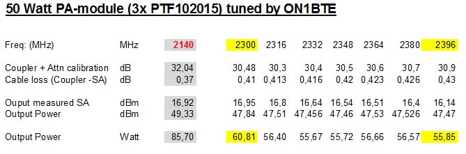 Van rechts naar links ziet u de driver met 3x XA3 (200mW), de eindtrap met 3x PTF102015 (MRF21030), directional coupler, dummyload en R&S SA/Tracking generator.