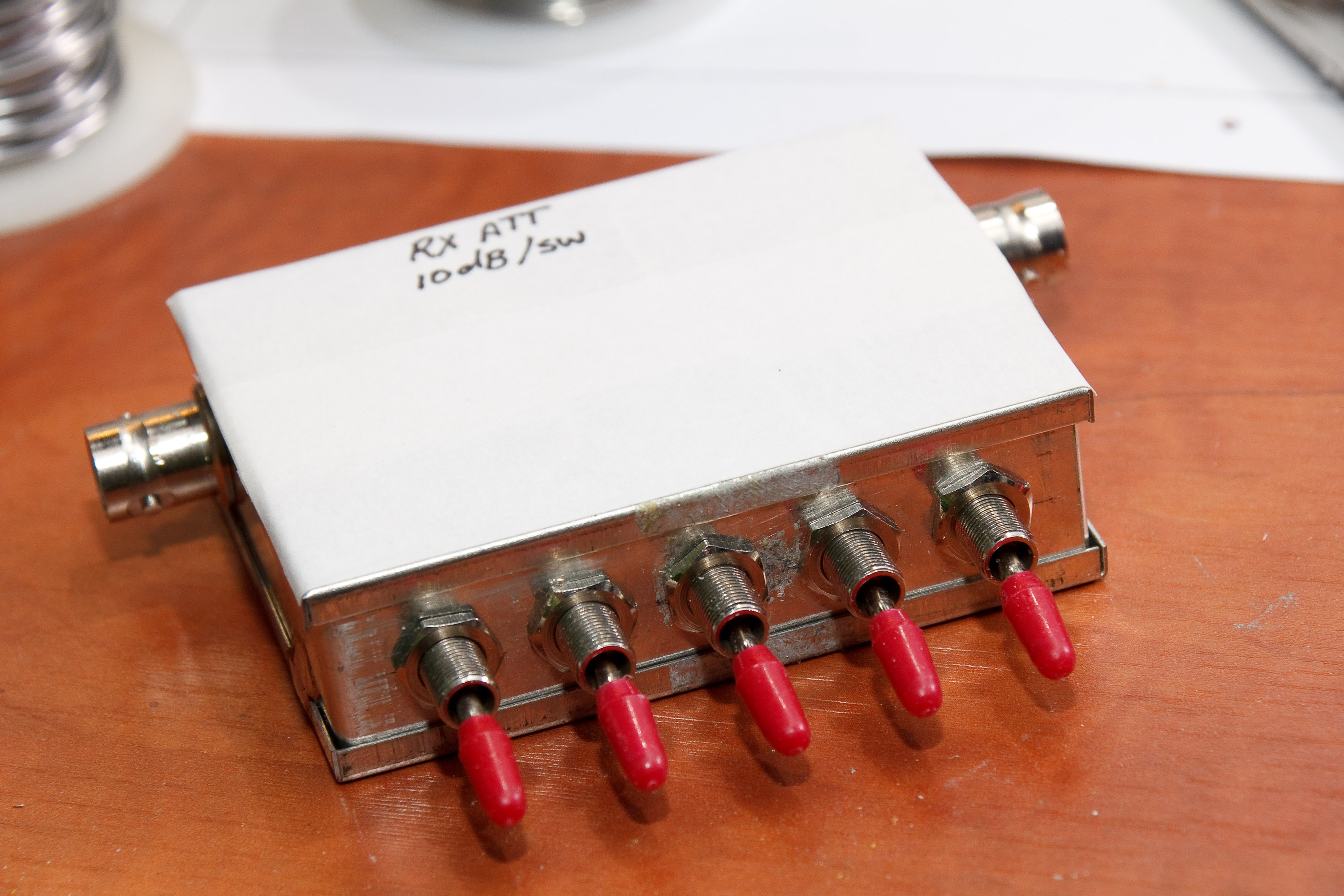Bovenstaand voorbeeld was niet voldoende (ging goed tot 20dB en niet meer). Het moet veel demping opvangen, dus werk met een plaat (stuk koper printplaat ofzo). Dit draadje werkt bovendien als een soort spoel. Ook missen de schotjes tussen de weerstandsnetwerkjes nog. Maar gelukkig had ik ruimte overgelaten: