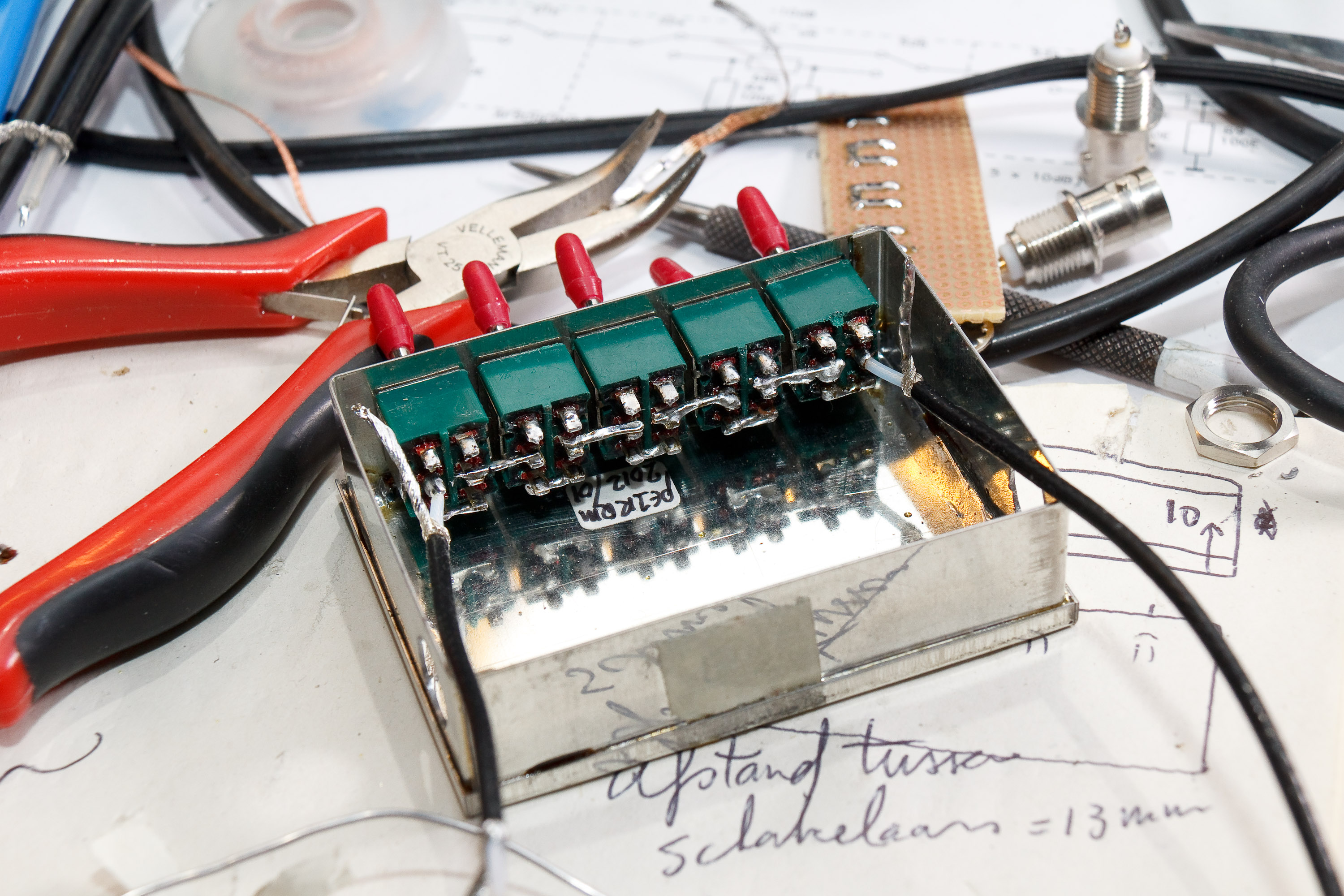 Ook gelijk de in- en uitgangs-coaxkabel solderen. Als straks de print gesoldeerd wordt op de schakelaars, kan ik er niet meer bij. Eigenlijk had ik de binnenader van de coaxjes nog iets minder ver moeten afstrippen. Tip voor jullie dus; houd dat kort, want anders kan het overstralen in het blikje. Ik had daar nu geen last van gelukkig.