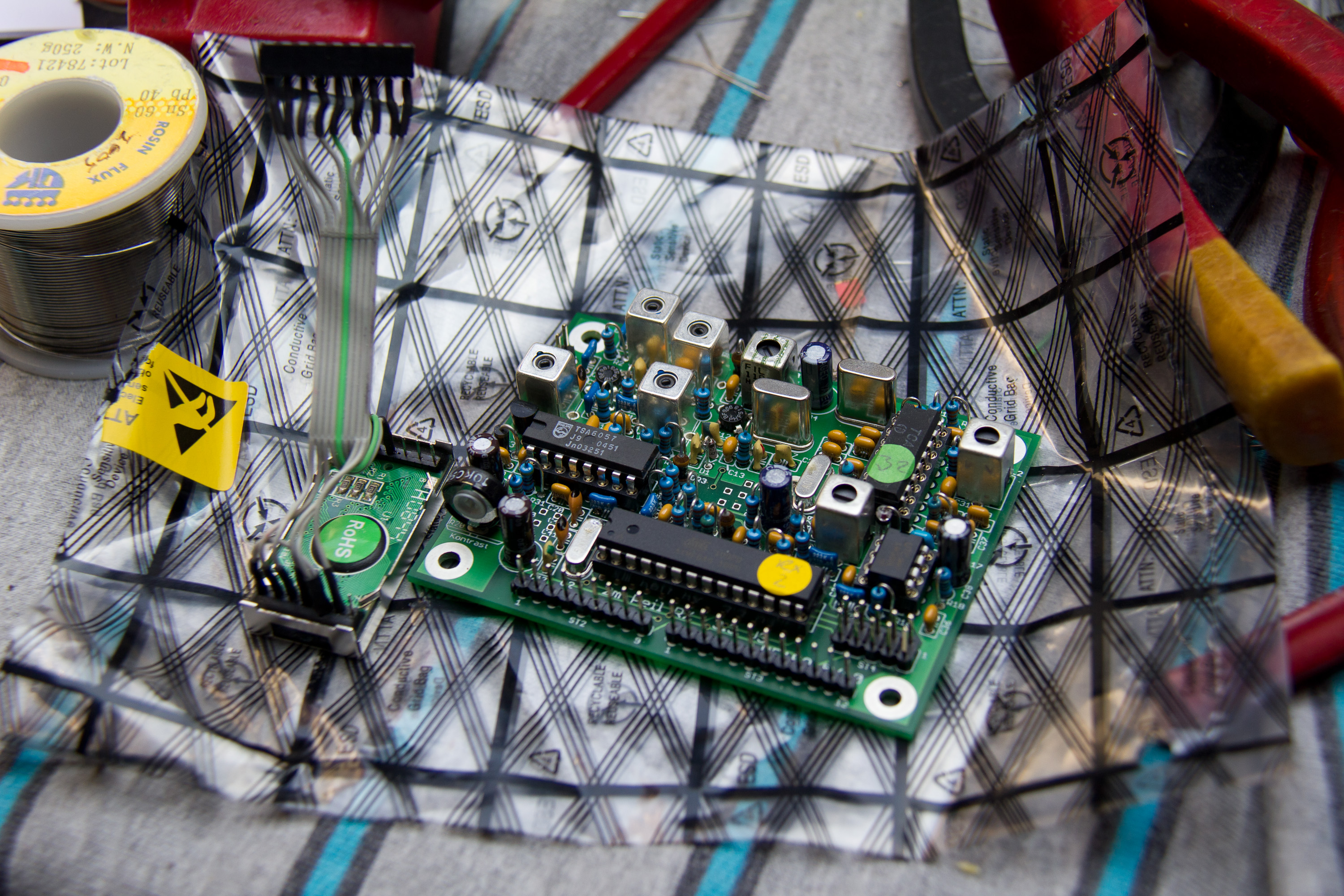 Ik heb nog maar weinig zo zorgvuldig verpakte bouwpakketjes meegemaakt! Wauw... echt heel netjes, kijk maar: De print is inmiddels al bestukt. Echt een knap ontwerp, zoals er zoveel onderdelen op zo'n kleine print passen! Maar dat maakt dit bouwproject ook wel weer wat geavanceerd. Beginnende bouwers kunnen beter hulp inroepen van een ervaren zelfbouwer ben ik bang. Je moet wel wat ervaring hebben, al was het alleen maar vanwege de juiste plaatsing en behandeling van sommige onderdelen (gevaar voor ESD etc.).