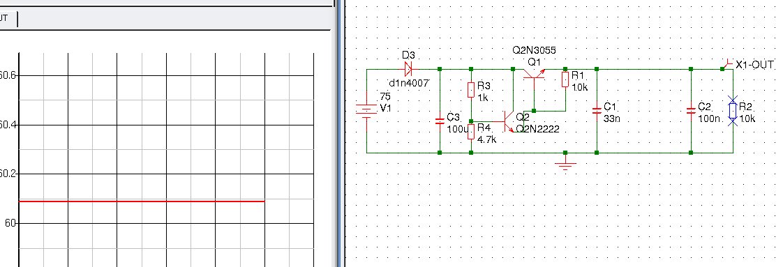 Hoe bepaal ik daar de uitgangspanning. Hij levert 24V tov de referentie dus moet de referentie 26V zijn om 50V uit te krijgen. Dat kan ik dan met een zener of een LM317 doen. Maar eerst moet ik dus die 75 volt terugbrengen met een zener ivm max spanning 78XX. Dat kan ik dus ook doen met een NPN waar de collector in en emiter uit is en de basis met een 60 volt zener aan de collector hangt en een weerstand van basis naar emitter