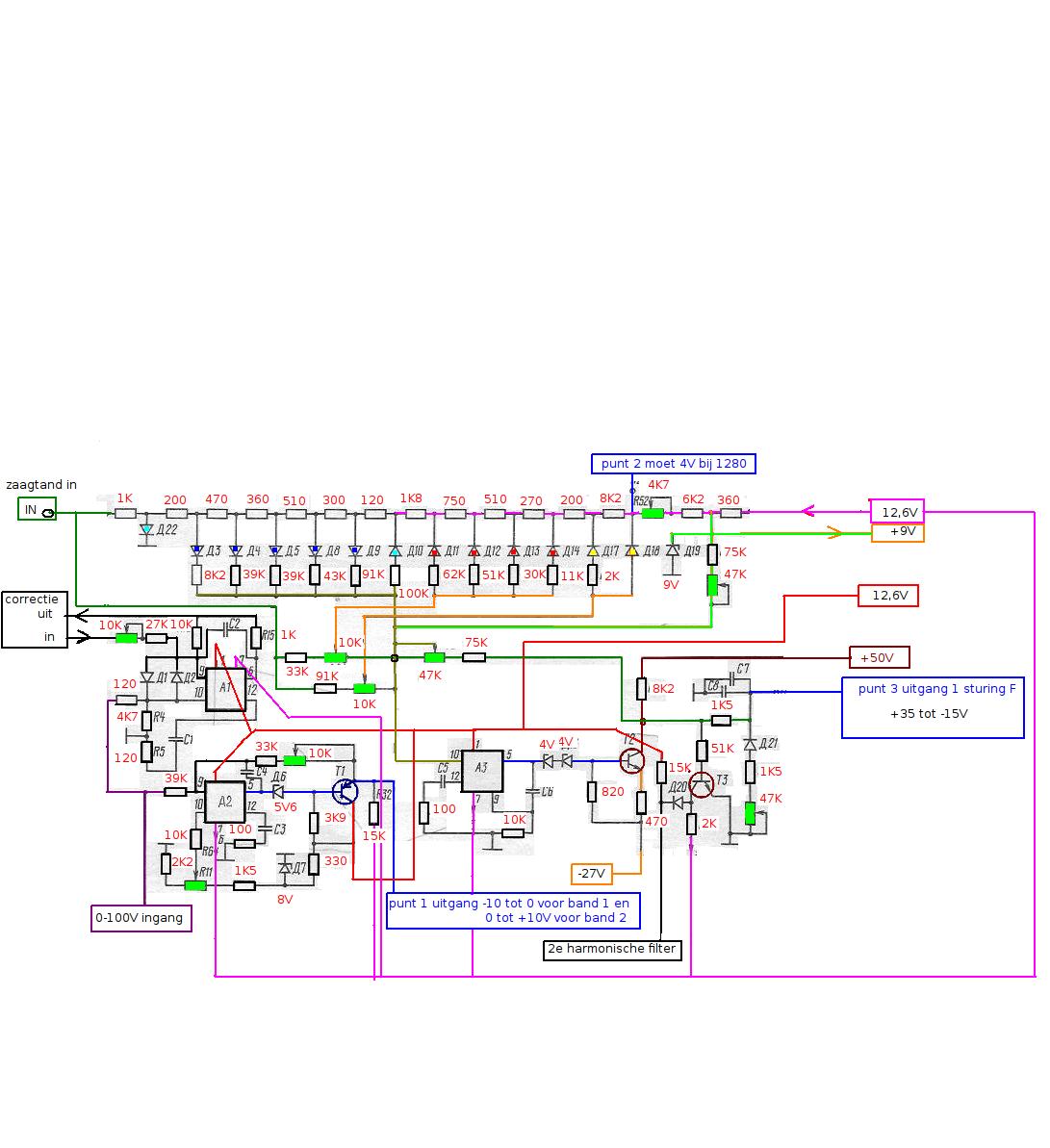 Maar ik snap het schema niet helemaal. Die diodes zullen wel correctiespanningen maken die via A1 weer ergens heen gaan.