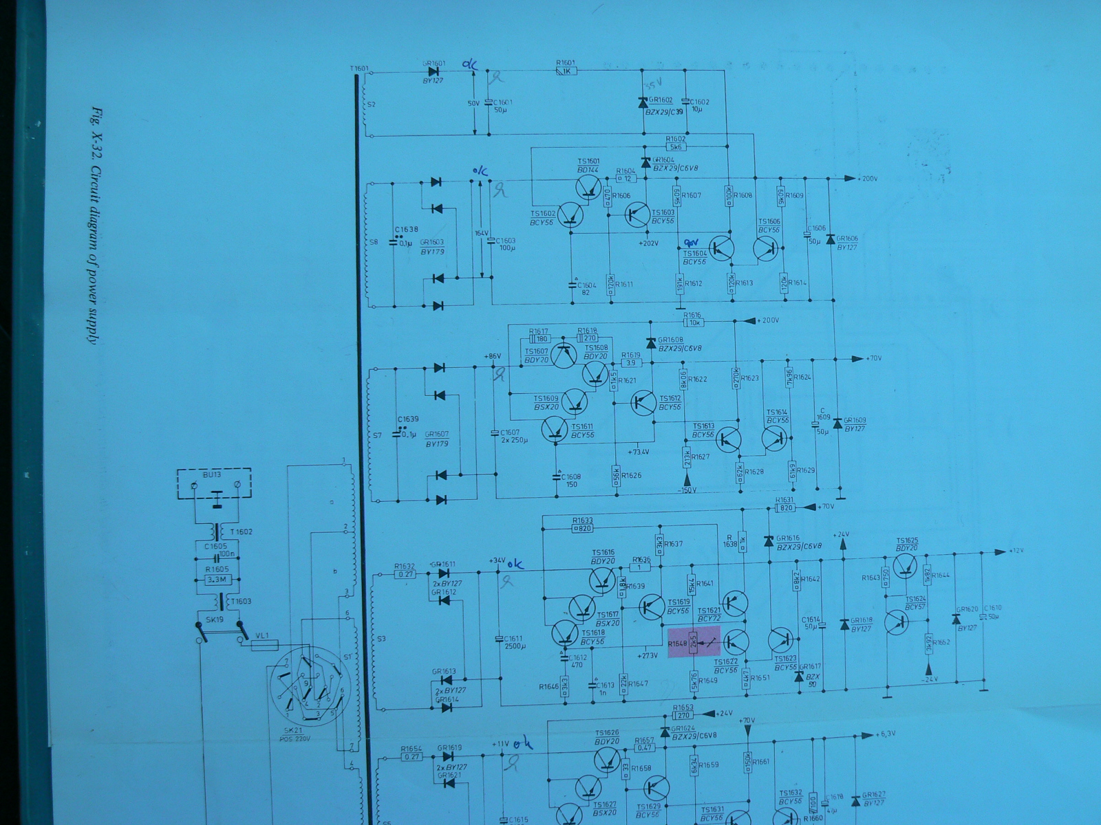 Ik zien nu hoe dat serie deel 200+70 zit. De onderkant van S8 hangt niet aan massa, dat lijkt maar zo maar er is geen bolletje in de lijn getekend dus alleen R1612 hangt aan massa. Er moet dus 130V over diode 1606 staan en daar staat nu 31V teveel. Het kan echter zijn dat die 15V blokgolf (S8/S9) te meter voor de gek houdt.