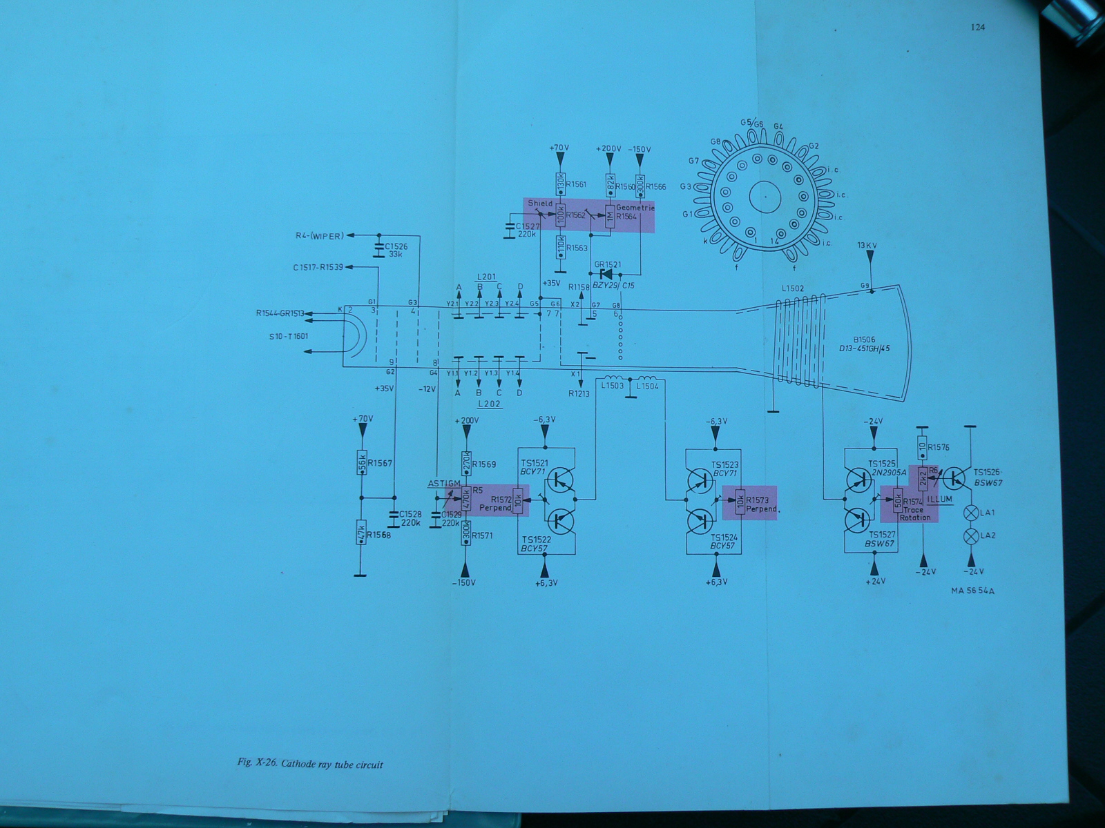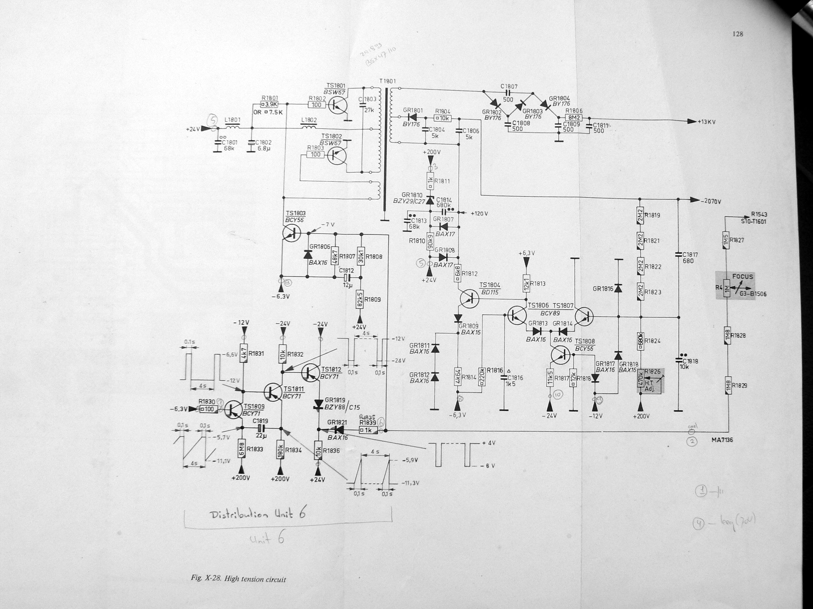 Maar in het manual staat dat na -150V de tweede spanning -24V is en deze is nagenoeg nul. Er staat wel 38V op de collector van tor 1639 maar 0V op de basis en 0V op de uitgang.