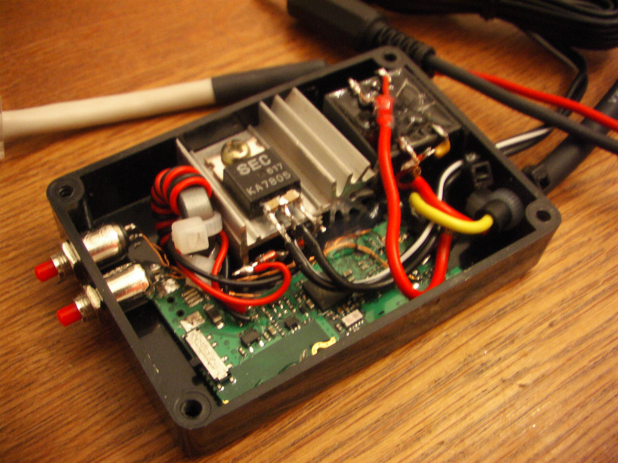 Om de unit ook in het mobiel te kunnen gebruiken heb ik gebruik gemaakt van een 7808 met een serie diode aan de uitgang zodat de voedingspanning weer op 7,4V uitkomt. Dit is ook de uitgangspanning van de 230V adapter die normaal gesproken bij de GN9120 wordt geleverd.